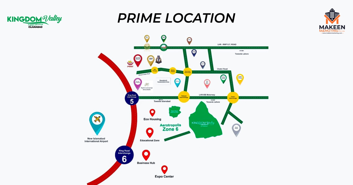 Kingdom Valley is located near key locations in Islamabad, including the main Jinnah Avenue, major schools, and hospitals. The development is also close to the Islamabad motorway, providing easy access to the city center and other parts of the city.