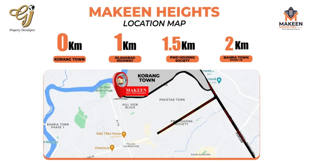 Makeen Hill View Heights is positioned at a key and prime location that is easily accessible from all the neighboring cities and locations. The apartments are located exactly in the Korang Town Islamabad. The apartments are placed in the heart of Islamabad.